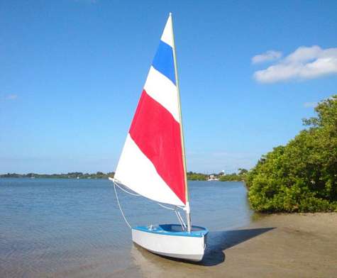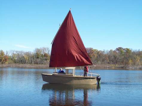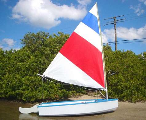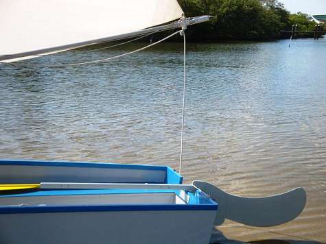 The sail is a 65 sq ft leg-o-mutton, the mast is recycled from an early windsurf rig, and the boom and gooseneck are of my own design. Andrew and I will be offering plans ASAP, hopefully in the next few months.