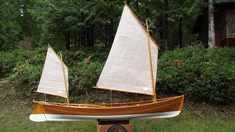 The idea was to draw a boat that could sail as well as be paddled with a double paddle. With three mast steps it can be configured as a standing lug ketch or sloop as conditions permit and we found in both ways it was well balanced. The steering for sailing consists of a yoke for the rudder and a push/pull tiller that took some getting used to. In paddling, the same yoke is rigged with lines that run up to foot pedals. This was last winter's project; challenging and tedious at times, built according to plan using red cedar for the planking and floor boards and Alaska cedar for everything else except white oak for frames. All the fasteners were stainless screws and copper clench nails for the planking. Everything is finished bright save the white paint on the bottom