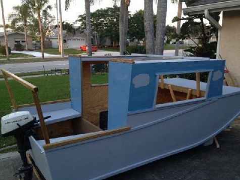 I finally settled on a name for my boat - Doodlebug. 10-1/2ft long and 56" wide inside the cabin. Rear seats are 30" long and angled for a better view under way. One adult or two kids per seat. I started with a simple idea two years ago - I wanted a small shanty type boat under 12ft long (lowest registration rate in Florida). I kept looking at the pictures of the Michalak Dockbox and figured out how to cut out a small corner section from a sheet of plywood 20" deep (and about 30" long) with an angle, that would become the cockpit by fiber glassing it to the other end.