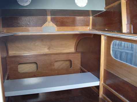 Craig has done a marvelous job of making the design come to life. So far he has tested it with a 2 HP motor, and it went quite well, pushing along at hull speed, about 4 MPH. He then upped the test to a 4 HP motor, and got the boat to plane. The estimated water speed is about 10 MPH. Craig is going to try a 6 HP motor after minor strengthening of the transom. He also reports that the boat is stable with 3 people aboard, and acts as any flat bottomed boat would in tight turns, heeling only slightly to the outside. The flat bottom design allows shallow water boating, with a loaded draft of less than 3 inches. The next thing he intends to do is set up the camper aspect of the design. He is constructing an elaborate entry door, with an opening window. This is far more than the plans call for, which is a rolled up canvas door, held in place with velcro.