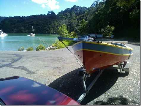 Well she floats - upright and on an even keel and best of all - NO LEAKS!!! Only a powered dinghy at the moment - no sailing rig done yet. She is very stable and tracks straight under power -very stable at anchor too. My brother John and son Benjie (who took the pics) came with me. We caught lots of fish on her first trip out but unfortunately none that were legal size so Chicken for tea. I do have a couple of issues with the centreboard and trailer but will get these sorted in the near future. After 7 years work ( I can't believe it took me that long) it is just good to see her in the water and everything ok.