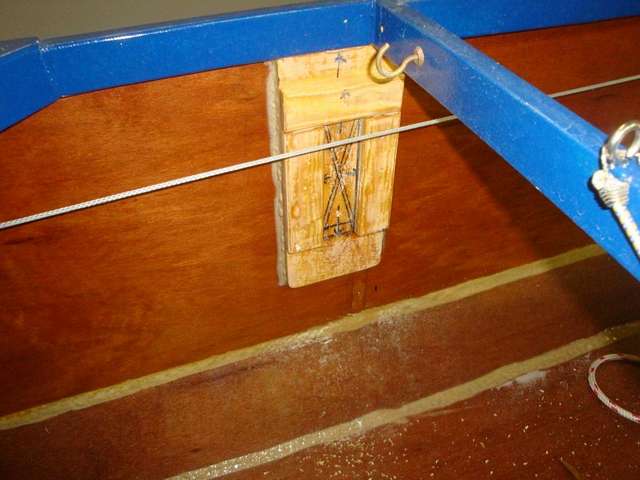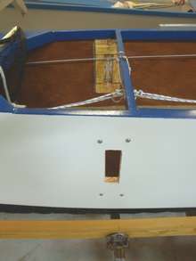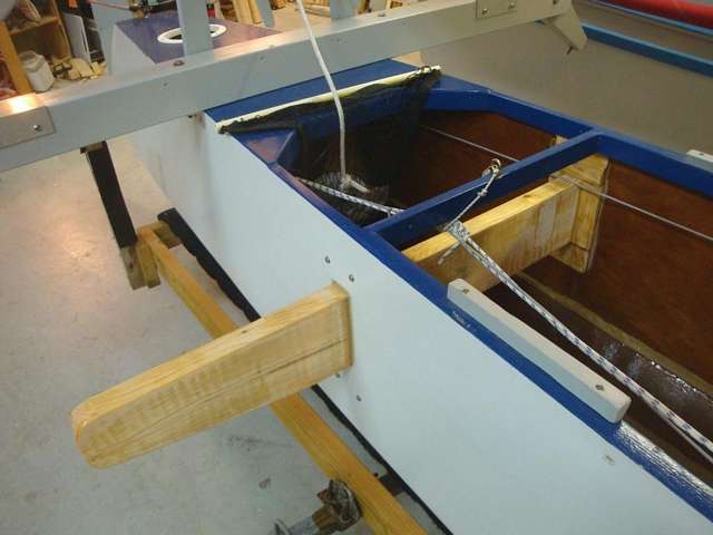 Inside view of starboard side support plate showing the 4 through-bolts. This plate is snug against the bottom of the sheer clamp and the inside of the bilge panel, and is glued to both. |