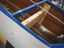 The plywood “butt plate” has had pieces of ½” x 1-1/2” stock glued on 3 sides before being glued to the port side of the hull. This counteracts the upward thrust of the 2x6 when the motor is attached. |