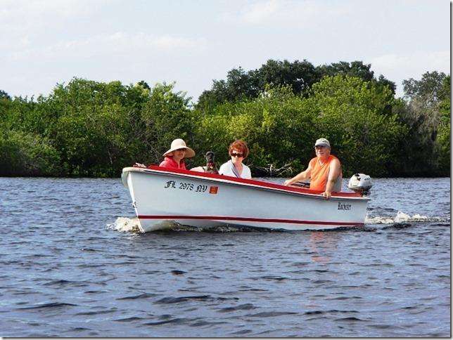 When Helen's sister Norma Ann was here to help me with the broken shoulder girl I needed a boat to go for river trips. "Helen Marie" was out of the water for a bottom job so I took the sailing rig out of the Core Sound 17 and ran it with the little 2hp Honda outboard. This is a great motor boat, it's very stable and roomy and goes like hell with this tiny motor and I was only running at half throttle. If you need a small motor this is the way to go and they're air cooled and 4 stroke so you don't need to add oil to the gas. These ugly sleeveless shirts you see me in a lot of the time are my work shirts for the shop. They are cooler than shirts with sleeves and when they get all painted and glue smeared I just turn them inside out to get a whole new life.