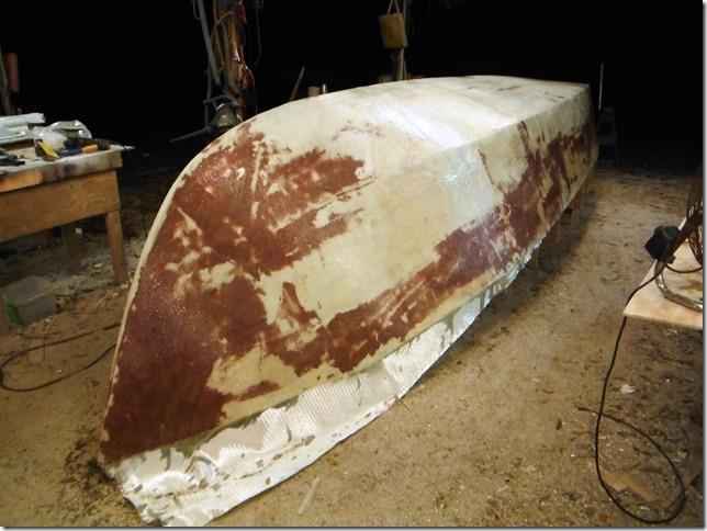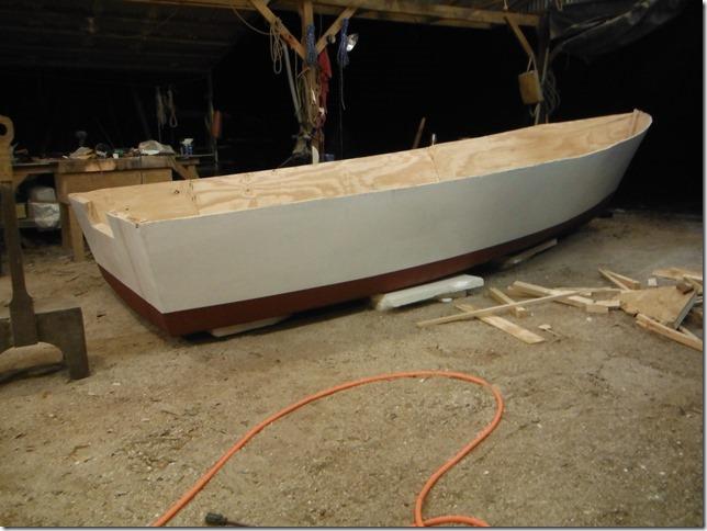 This thing looks just like a giant Core Sound, maybe I should put a big sail on it. All of this glassing and grinding and filling and sanding and sanding was a lot of work but as you know I actually like to sand if I can use power tools. All of this from start to finish took me just a week to do. I like to go out to the shop after dinner and work from about 7 to 9 which eliminates a lot of waiting for epoxy to dry if I do it during the day. Now to start the inside. More make it up as I go along.
