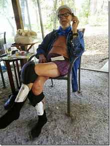 This is Red out in his little boat, "Tom Hand" and later lounging in the Tiki hut having a cold one, wearing his knee and shin protectors and puffing on what may or may not be a Cuban cigar. Red is a classic example of how to grow old gracefully or maybe that should be how to not grow old at all. He is an inspiration to all of us.
