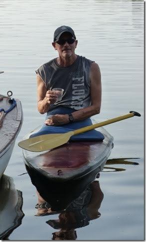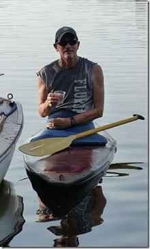We had a bunch of visitors last weekend out off my beach playing with the foam kayaks. Steve was the lifeguard seen here in this thing he calls a C1. You have to strap yourself in to keep the water out; I doubt that's water he's holding in that cup. He did real good, no one was lost.