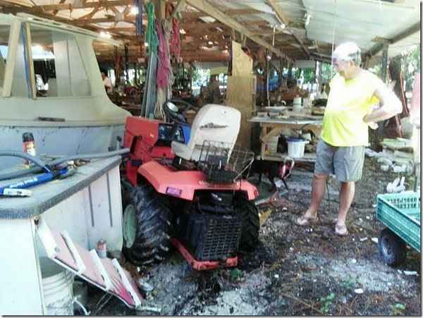 Here comes a story that you will absolutely, positively not believe. This can not happen in a million years. I was out working on my boat and noticed that the red tractor looked strange; this is what I saw. Some time during the night the Gravely had been started up, driven in a big circle in the yard, run over some saw horses and stuff, hit a shed pole and sat there running digging a hole till it's gas ran out. We all gathered around to figure it out and came to the conclusion that a ghost had to have done it. We never get any vandals out here at the end of the world and this machine isn't the easiest thing in the world to start and make go. We gave up on trying to figure it out till happy hour. We had moved it back out into the drive way and were sitting having a few cold ones when I heard it start up. I figured that one of the guys was doing something with it till Steve yelled, "holy shit, it started itself up again". All we can figure is that water got into the starter switch and shorted things out somehow. Why it would do it after sitting out on a sunny day is beyond me. It wasn't in gear this time so it didn't go anywhere but that did explain things, I guess. We got a new switch.