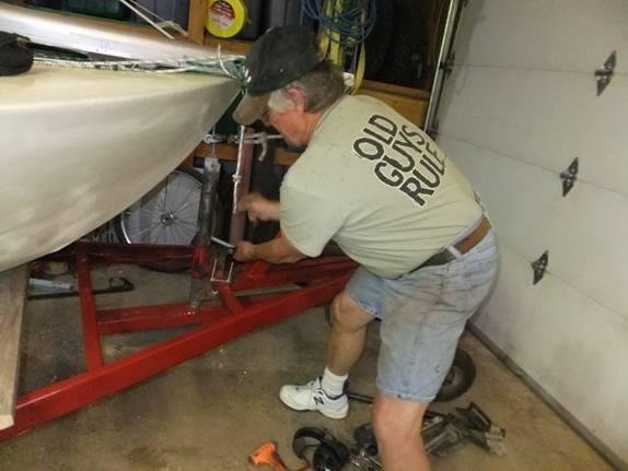 The trailer, here, is tiled up at about 15 degrees, and I could roll the boat off onto the garage floor with the bow line released. Just a few quarter-rotations with a wrench! There's more. But, you've probably seen all the Too Cool Fer School stuff you care to, for today.