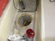 There I stood. Roto-zip in hand. A circle drawn on the cockpit floor. The basic plan of attack was quite straightforward. (a). Cut circle in floor. (b). Drop pipe through the (perfectly round, perfectly perpendicular, perfectly fitting) hole and scribe line around pipe for second hole, in inner liner. (c). Cut second hole (perfectly, of course). (d). Drill locating hole through hull, and repeat.