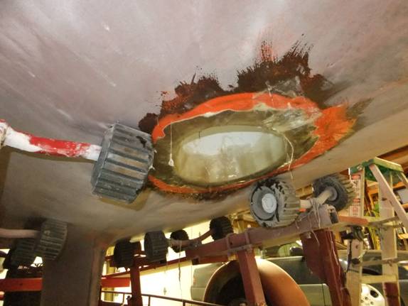 Laying flat on your face, peering out of the corner of a dirty set of shop glasses, under a fogged up set of goggles with a router held at arms’ length, is decidedly NOT the way to cut a “perfect hole.” In fact, I couldn’t quite even see where the router was actually headed, until it had already run for an inch or so in what ever direction it was already headed in. Even so, I could in fact tell something had changed by the sound of the thing. You see, this second hole was only supposed to be in the fiberglass liner. Sooooo, when the bit slipped in the collet and drove on down through the hull; I think I was fully involved I that phenomenon Clausewitz called “the fog of war.” Do all the planning you care to. But, when it gets down to the actual “combat,” better be prepared for absolutely nothing to go according to the carefully debated plan. Seems the second hole was sort of almost cut fully around, by then. The third hole was supposed to be (revised version) held in abeyance until the first two were trued up, and all that.