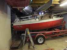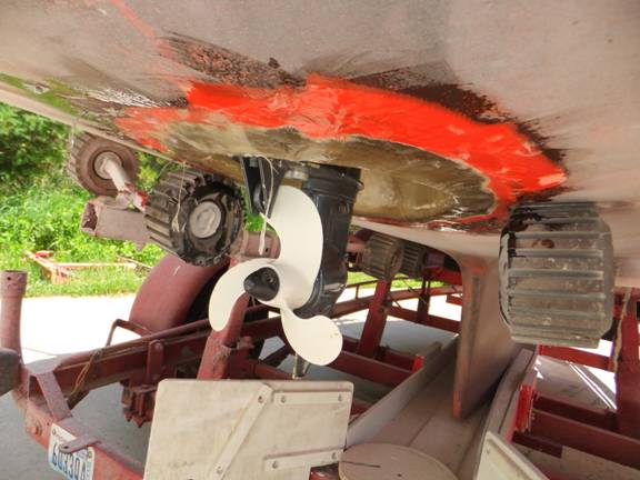 The added weight in well–saturated glass that was supposed to bond up into the plastic tube and around the corner to the ground-off hull surface started causing a bit of a chain reaction. I’d get it all pushed into place, and leave the room for a while. I’d come back to find it hanging in tatters. ‘Pox dripping all over the floor. Quite a mess. So, for several hours, I uncharacteristically patiently knelt and craned my neck back while I continued to push the gooey stuff back into place. Until it started to kick. Finally. Next disaster.