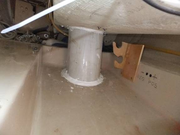 Second hole. Oops. There was a molded stiffener athwartships right where my second hole was supposed to land. Oh well. I’ll just angle the pipe forward a bit. Should be about a 20 degree declination anyway, for the standard outboard transom mount. This is of course under the footwell on a SIXTEEN FOOT sailboat. Room for snakes and kittens, perhaps. I’m wriggled in there with a router, a respirator mask, ear muffs, goggles, and my 68-year old torso. Feet stuck up under something in the cabin. Even so, it all still seemed doable. Said the spider to the fly…