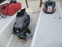 Several years ago, I bought a pretty nice air cooled 5hp Mariner short shaft just for this job. The big idea was to run it down through a well of some sort, and then make these perfectly fitting plugs that would seal off the tube from exhaust smoke, etc. The air cooled power head wouldn’t need to have water splashing and squirting around in that tube. But the vertical distance from transom clamp to cavitation plate wasn’t more than a pencil mark over 17 inches. This angled thing that I had embarked upon pretty much on the fly was looking a lot more like 18 inches, or even more, would be required. But, like I was saying, “press on regardless.”