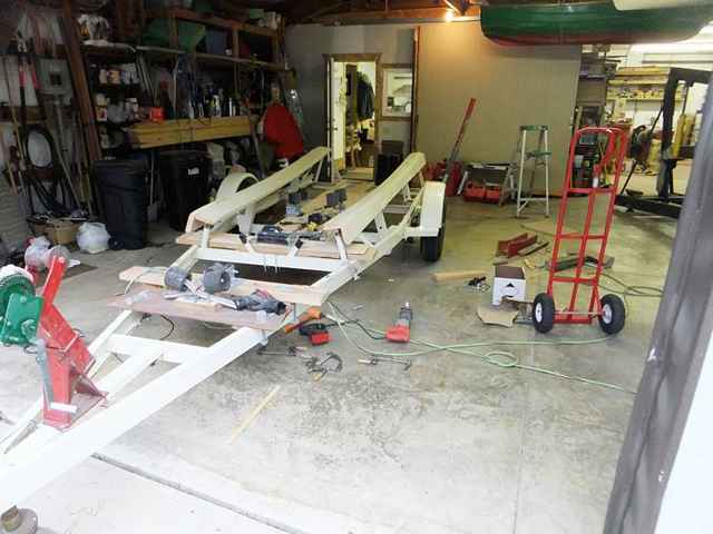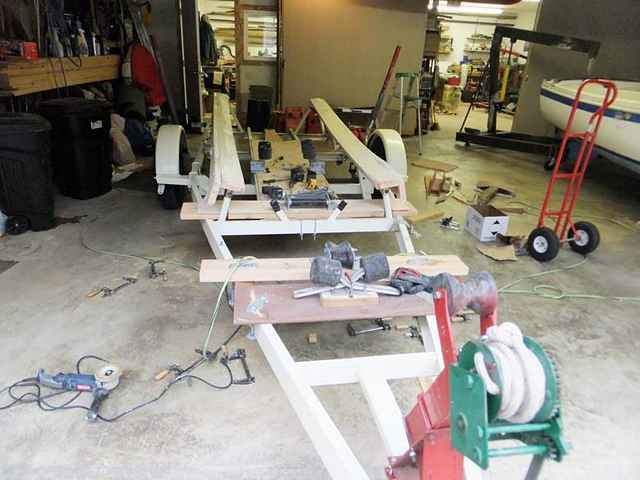 The biggest reason we keep coming and going to the launch ramp is to decide how to make the boat roll easily into and out of the water - while riding a solidly as possible during those over-the-road interregna. You see, my sophomore geometry teacher, Mr. Robertson, made me a promise of sorts. Back in high school. He offered to give me a passing grade, if I swore on a stack of Euclidian tables and theorems and postulates that I would never take another math class from him, again. You could say that my arithmetic acumen is somewhat deficient. Where the RTG’s can probably figure this stuff out with a tape measure, bevel square, and a few properly-fitted parts; I have to pretty much do it by intuition.