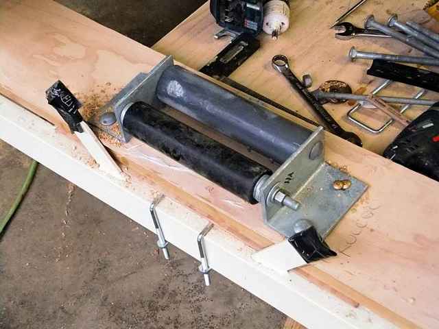 I was in the process of inventing, manufacturing, and installing a series of home brew rollers that should guide the boat into the center line as she comes back aboard the trailer, and make the slams against the trailer cross bars much more agreeable by substituting rollers, chocks, and lotsa large bolts and nuts. While it did take at least five times longer than the Planning guys so confidently predicted only last night; things were actually looking “put together” enough to try a test fit.