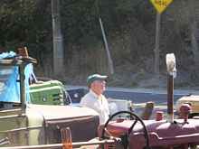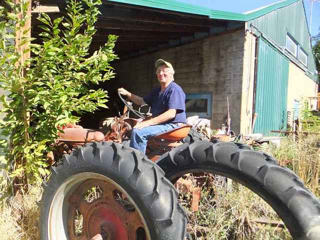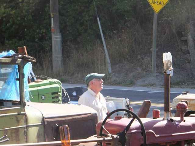 After the “universal salutation” that I find useful in these free-form expeditions, “Hey, guy! Is that the original paint…?” A fellow emerged from the shadows. “Nope…been repainted…once…bought it new…” Also in the garage was a WWII baby cat, a vintage Minn’Moline, a collection of make & break engines, and a grand daughter. She was on the lower end of the broom handle. Deftly sweeping the floor, while apparently not missing a single bon mot via text message. I asked him about the tractors across the road. His, too. Come to find out, this is somebody else that I “know” without ever having talked to him. Mick is the guy I sent the pictures to, of last September’s messabout gang sitting on his tractors, standing amid the ancient iron, and generally having a ball.