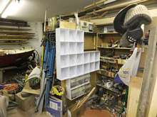 The old power tool bay now has fasteners in tilt-out bins, and will soon also have cans of bigger/heavier stuff on the opposite shelves. You know, stuff like trailer bolts, and deck cleats, and odd bits of hardware and electrical devices. The sort of thing that accumulates in EVERY workshop.