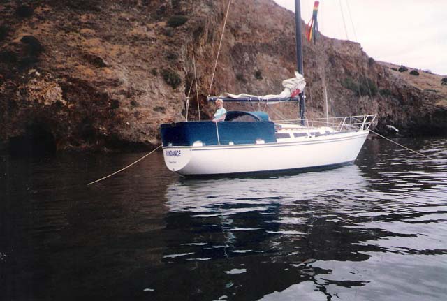 Wife Kate aboard Raindance on a family outing to Santa Cruz Island. Two anchors out to hold against the constant surge. |