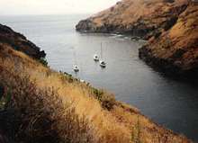A typical SOCAL island anchorage. Tight between the cliffs, and open all the way to Antarctica. |