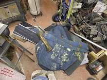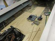 One morning, when I went out to the shop to just sort of check on things, everything was in a tizzy. The building folks had put "Roughneck" back on her trailer and hauled her off to storage again. Talk about a lot of man hours and effort. Somehow, there was yet another forlorn hull sitting on the building cart with piles of stuff being ripped out and perfectly good plywood getting reduced to dust, noise, and small chunks all around it.
