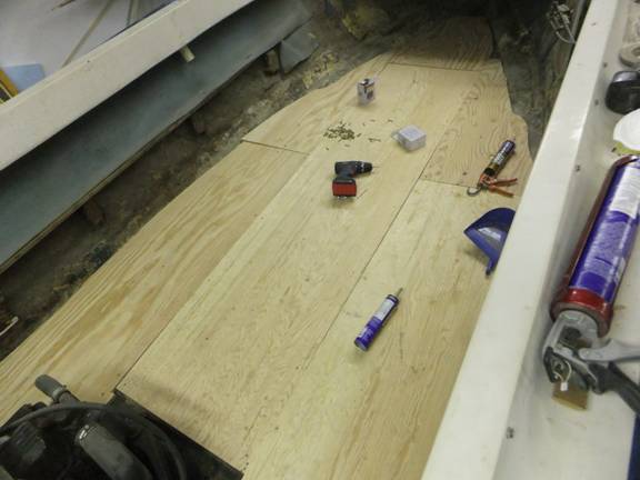 The idea was to allow for a place to step over the windshield to, from the foredeck. And, it will become the substrate for tigerwood strips. In fact, all this fir plywood is supposed to become substrate for more decorative wood coverings. At least, that's the plan from this vantage point. Some have suggested (gently) that this project is gonna' take a lot of lipstick. And, hopefully, that wood overlay will be just the lipstick required.