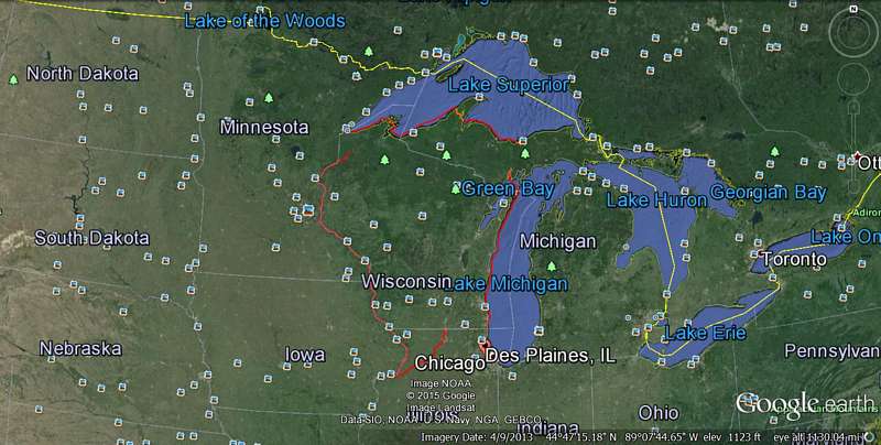 What makes this idea work is that Wisconsin is tucked into an elbow of the Great Lakes, bordered on the north and the east by navigable waters. And on the west, the Mississippi and St. Croix rivers. Add in a relatively short upriver jaunt along the Rock River, and a couple of portages, and a complete circumnavigation of the state becomes possible - not bad for a Midwestern state more than 1,000 miles from salt water! Here’s the idea (the route is marked in red):