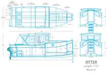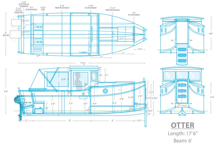 I eliminated the midships storage compartments and gave that space to the cockpit. Since I had garage space and we’re just supposing, lets stretch it two feet to 17 1/2’ and add that space to the cockpit too. Wow, what was a 5’ long by 6’ wide cockpit just became 8’ long by 6’ wide. Room for a rear bench with lots of space to spare and we still have a cabin that can sleep two. Maybe we’re on to something. Now for the looks department. Jim said that he designed the sides of the cockpit high at the request of the boat’s original builder who had kids and was worried about them falling overboard. But in my opinion, it’s that high shear line on Sow’s Ear that makes it so homely. Lowering it aft of the cabin makes a huge improvement in the boat’s appearance. Finally, I added a collapsible windshield/pilothouse roof (which necessitated changing the slot top to a sliding hatch). Otter was born.