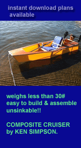 My evenings were spent perusing Duckwork’s “Mike’s Boat Index” for the perfect plan. I am a big fan of Phil Bolger’s and Jim Michalak’s form follows function designs, especially the “box boats” with no flare. That’s a good thing because my boat building skills are pretty much limited to stitch and glue and nail (screw) and glue construction.