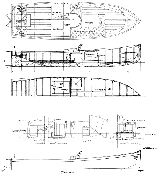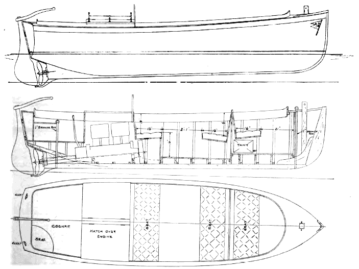 The boat is not designed for speed, as may be seen at a glance; her speed with two persons on board being about 4 1/2 to 5 knots. However, the plan shows smooth lines with a lean entrance and ample flare forward. The after forms have been made full, affording sufficient buoyancy to allow of the engine and all connected with it, including the operator, to be placed abaft the lazyback which divides the interior, leaving a seating space 4 by 5 1/2 feet clean and clear for passengers. This arrangement has the additional ad vantage of bringing all the weight aft when the tender is light and in tow.