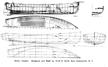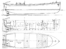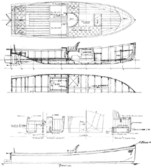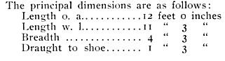 Her dimensions are: Length on top, 10 feet; water line, 8 feet 7 inches; beam extreme, 3 feet 8 inches; at water line, 2 feet 9 inches.