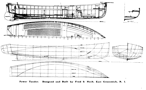 The plans on the accompanying page show the lines and general arrangement of a thirteen-foot power tender designed and built by Frederic S. Nock, of East Greenwich, R. I., for Dr. F. T. Rogers, for use on his yawl Truant. The owner desired a light power tender, of not over 300lb weight, to carry on davits and capable of carrying six persons besides the crew. In the majority of the small power tenders, the engine is placed aft, and there fore the best of the boat is rendered useless as far as seating accommodations are concerned. Where the engine is not of any great weight the arrangement as shown is good, as it keeps the after part of the boat for the guests and forward for the crew. This boat was not designed to be towed astern of her consort and the weight of the complete boat is a trifle under 225 Ib. The planking is 3/8 in. cedar, the gratings, seats, sheerstrake, mouldings, etc., of mahogany.