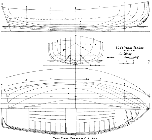 THE above plans show an excellent type of yacht tender, and any yachtsman who intends building a tender during the winter months for next season's use can not do better than to build on the lines given here through the kindness of Mr. C. A. Macy. Proof of the boat's good behavior is given by Mr. Macy, who writes as follows regarding her:
