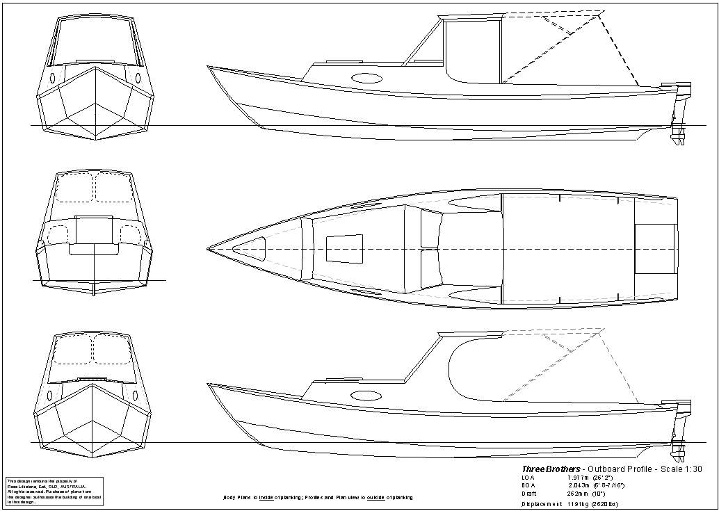 The accommodation can be ‘cozy’. I’d like to string it out lengthwise to produce a long, narrow, low and light boat that is easy to tow and to power. Sharpshooter runs at 9 or so knots in the rough and about 19knots flat out, fully loaded, on 30hp. This is fine, so if the expanded boat could do that with maybe 50hp I would be very happy. The major difference being …. I want to be able to run smoothly in a chop. (You know the sort of water I’m talking about, and 8 to 10 knots in those conditions would be fantastic if sustainable.)