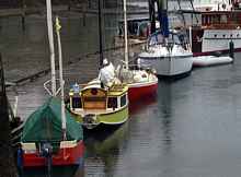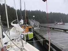 The party broke up on Sunday morning to the backdrop of forecasts for heavy rain, gale-force winds against the strong ebb, and otherwise less than satisfactory conditions for sun bathing. Tom and "Reset" had possibly the worst of it. It's a 30-mile point to point run for him in a boat with a flat water speed close to a brisk walk in the park. What he ran into was anything but a walk in the park! With an inflatable dink in tow and rain blowing sideways, he had his bow anchor slip its chocks in the Tacoma Narrows. Gusts blowing above forty had pushed the outgoing tide into quite the confused and breaking stuff that stretch is known for. The bad news is there wasn't anybody there to get pictures of Tom out on a bow alternately diving under water and lurching for the sky, retrieving a Danforth on chain rode before it managed to anchor him just where he would never want to be anchored.