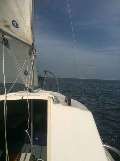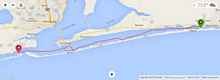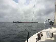 Re-fueled on diesel fuel and fish tacos, we set sail once again for the last push to Sand Island.  The breeze had continued to build so both Scott and I tied in a reef and proceeded into Pensacola Bay.  While Scott choose hugged the shoreline in search of smoother waters in the building breeze, Bandit and I blasted directly across the bay, dodging huge “death barges” and making 5-6 kts even with the reef.