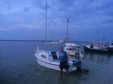 Finally rounding the true Big Sabine Point, I was happy to see a nice grouping of a dozen or more boats already anchored on the beach.  In short order, I began to hear shouts of welcome. Minutes later, my little Potter joined the line of interesting small boats anchored along the shore of the shallow cove.