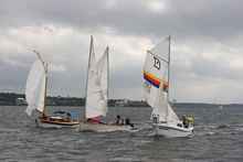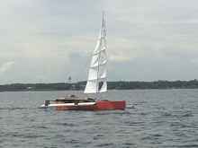 Scott Widmier’s self-designed scow “Otis” and John Bell’s Core Sound 17’ “Bandaloop” struggle to overtake Bandit.  (We let them pass to preserve their fragile egos…)