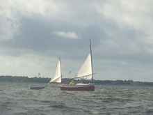 At around noon, I finally passed under the second causeway bridge into the East Bay and things finally did start to get a little bit better. The seas smoothed and I was able to fall off the wind and relax a little for the first time in hours. Ahead of me, I could see John Gibson in his Bolger Micro “Pete” and William Seyler and Doug Moran in their sharp little Pocketship. I followed along in their wakes and at long last, the sheltered, grassy point that was Skull Island hove into view where I could see several other boats waiting at anchor.