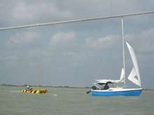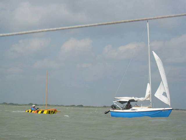 Rick also lost his rudder. Chuck Pierce comes up (CP is the current president of the T200 Board and the leader of the PDR’s cancer funding campaign,) and tries towing rick in his PDR! Wow that man has balls of steel. Anyway, Chuck P. capsizes. And His mast stuck right in the bottom of the bay and snapped off. We have gone from suck to blow! You remember the guy from the Princess 22? Travis Votaw I believe is his name. His son was with him too. Anyway, Rick goes off with another boat who can tow him and gets sea sick for 90 minutes and Travis’s son jumps in to help Chuck. With both they’re weight they right the boat. They take the broken mast and start shaving the stump down so that it will fit in the mast step. It takes a while but Chuck finally got everything ship shape and was able to head on. He lost a lot of equipment of course. But he says he looked at the names on his boat of everyone who had succumbed or beaten cancer and knew they had gone through much worse, and Chuck carried on crossing Red Fish Bay.