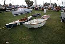 done! We had some sanding (thank God for 36 grit sanding belts!) some more filling, and the addition of breasthooks, transom knees, and a couple of crossbraces here and there. The watershed event, however, was removing the two building molds from the center and forward end of the boat, which was now by all accounts a boat! Adding those accoutrements, two runners to the bottom of the hull, and a little sanding filler made her water resistant enough to take to the launch ramp and to join the rest of the armada! Lined up on the launch ramp we had a proper christening (with real Champagne, not with Natural Light beer as was suggested) and a blessing of the fleet, and off our noble vessels were! Yonder, into the harbor!