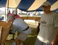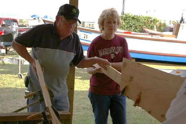 The actual boatbuilding began Friday afternoon when the groups attached the sides to the precut stems of their future vessels. This included the addition of epoxy and screws to hold the sides in place while the epoxy set. Soon transoms were added to the sides, and in the interest of the epoxy setting properly, some gaps were filled and the boats were left as is until the following morning. I feel like the builders really weren't able to grasp the sense of how much progress had been made at this point, but we tried to fill them in on what to expect the next day. Sure enough, another beautiful Port A morning found us under the tent and after it. A few adjustments here and there, a little Frank Coletta on a mission Bending Sides more epoxy, and we were cleaning up the chines to receive the bottom, which was installed before lunch. The bottom to our boat wound up a little shy on one side; it needed to be about ½" to ¾" wider than it was to land completely flush with the outside of the chine. After Frank assured us that this was no big deal as the chines should be covered with fiberglass tape anyway, my group very amiably said, "We'll just add a little more Pookie, sand her down, and no one will ever know." Some more sanding,