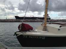 Some serious ship traffic comes into and out of Aransas Pass. Here's one of the big guys as seen over the bow of a very nicely built Nancy's China designed by Sam Devlin and built by Aaron Ward.