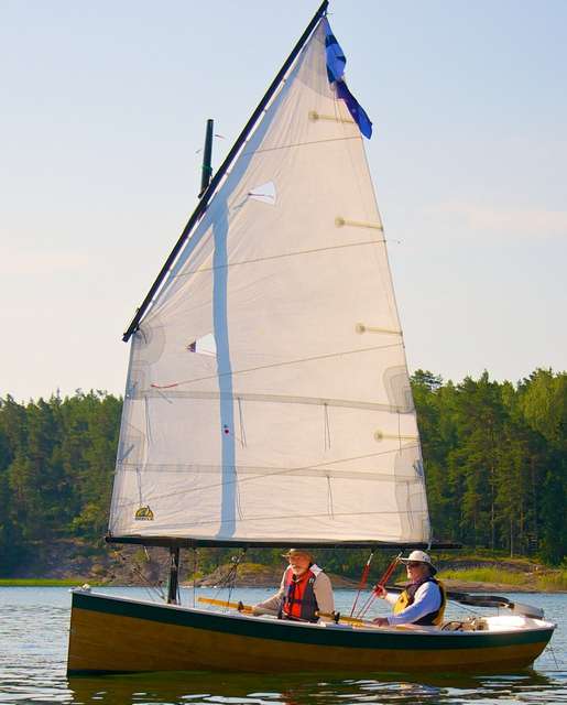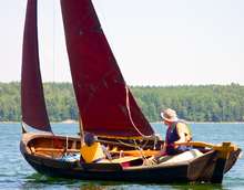- Fredrik Koivusalo and Kristina's clinker gaff sloop Gna, a school-built replica of a traditional Enklinge julle. Enklinge is an island in the Eastern Åland archipelago. Fredrik told me that Gna is named, tongue in cheek, after Gna of Nordic mythology - the goddess of fullness and a fast harbinger for the other gods. Gna has slot-in splashboards to increase freeboard either side of the rowlocks.