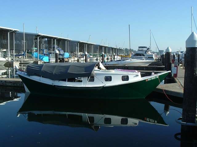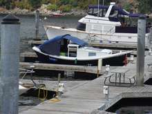 Camping on a small (26 ft) dory however does create some problems when the cabin can only hold two. Mom and Dad have to sleep in the cockpit, and given that we live in the Pacific Northwest, it is not often wise to sleep under the stars. In the first ten years of our cruising I tried a variety of tarps and tents over the cockpit to provide protection as well as privacy. Nothing seemed to work well. Either they leaked or they took forever to put up and take down, and we could not stand up in the cockpit. The first picture (Fig. 1) shows the best design I could build. It worked somewhat but was not optimal. It kept the rain out but didn't let us stand up.
