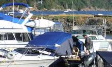 A bimini top alone however, does not provide any privacy, nor does it keep the rain from coming in the sides. The obvious solution is to attach sides to the bimini to cover the exposed areas. In looking around the marinas, this is what I found on the larger power boats with flying bridges. Most boats had clear vinyl for sides, but this really would not work for us because we needed privacy when we slept in the cockpit. So, I purchased some marine polyester fabric and sewed sections to fit between the bimini top and the sides of the boat.