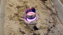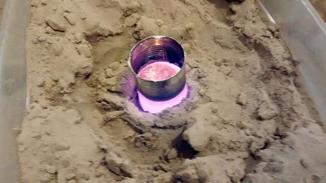 Finally, you pull the mold out of the furnace, and set it in some sand (so any aluminum you spill is safely contained). Melt down some aluminum in the furnace, and pour it into the mold: