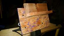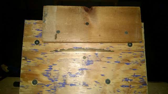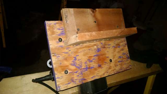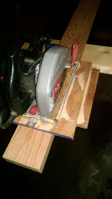 Now the bit that allows you to make a straight cut... grab a piece of 1x4 or similar (ply would work) with a straight edge and about a foot long to use as a fence piece. Need 1-1/2x3/4 sticks? Grab another piece of 1x4 (or 1x2 or whatever is 3/4 thick) to use as a spacer. Place it on edge against the saw blade (unplugged!). Which side of the blade depends on if you're right or left handed. I prefer it to be on the right side of the blade since I'm right handed. Place your fence piece of 1x4 flat on the ply foot plate and up against the spacer piece. It helps if it extends forward of the blade a bit. Run 3 or 4 drywall screws through the fence piece and into the plywood foot plate. They need to be short enough to not hit the metal foot plate. Now remove the spacer piece. Viola, circular saw with a ripping fence!