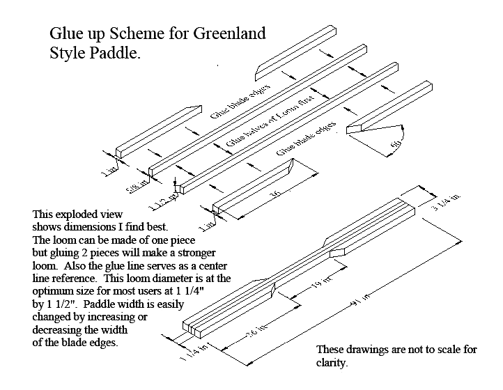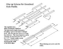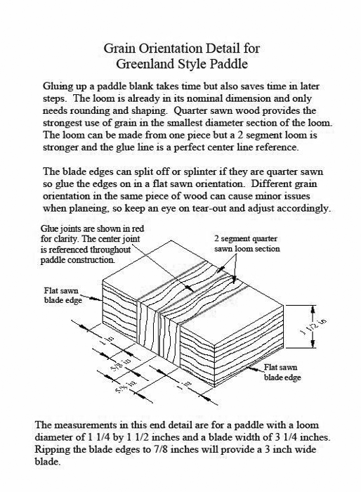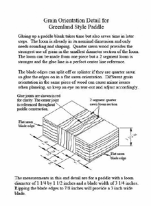 (see Grain Orientation Detail illustration) with no run-out and no knots in the "usable area". My approach requires lots of rip cuts into long skinny pieces that are glued-up into blanks. I use only Gorilla Glue, the brown stuff. It requires lots of clamps but dries in less than 2 hours and make an excellent waterproof bond. I soaked a cut off end part of a paddle with 4 layers and 3 glue joints in water for several days and the glue joint was stronger than the wood. The piece I soak tested was very similar to the drawing in the "Grain Orientation Detail" illustration.