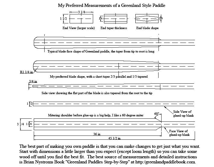 Greenland Paddles (GP) are also made to measurements of the individual paddler and their kayak. After making half a dozen paddles, I found what works best for me. A length of 91 inches with blades of 3 to 3.25 inch width and a loom of 19 inches long with a 1.25 by 1.5 inch oval are my basic dimensions. I am not trying to make an authentic replica of a specific GP, I am making Greenland style paddles. I have not written a step by step tutorial, for that I suggest Brian Nystrom's book Greenland Paddles Step by Step which is the best DIY book I have found. There are also dozens of different instructions and videos online. The QAJAQ USA website is a perfect place to start, pay attention to the "Common Mistakes" section.